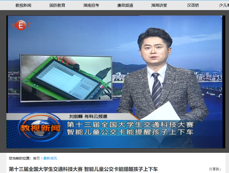 湖南教育电视台:第十三届全国大学生交通科技大赛 智能儿童公交卡能提醒孩子上下车