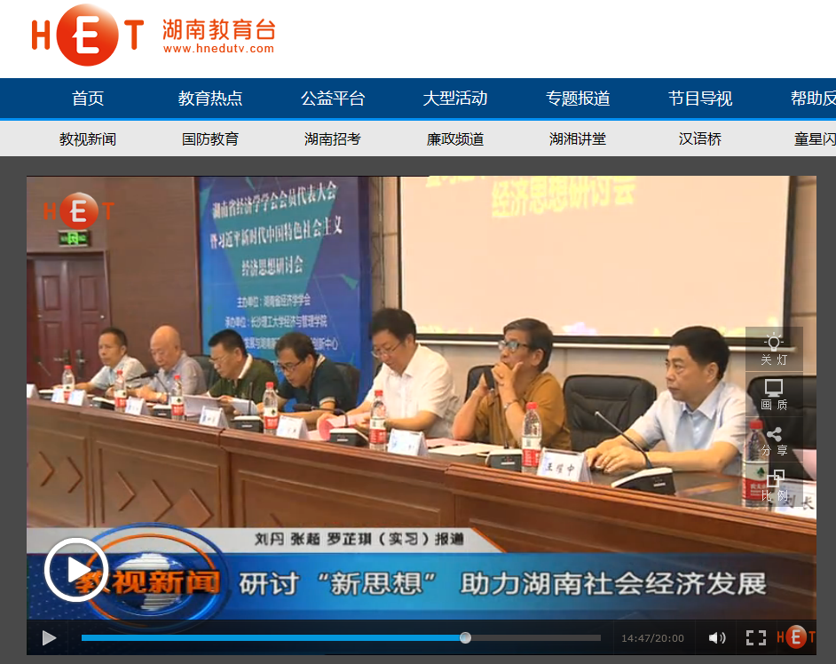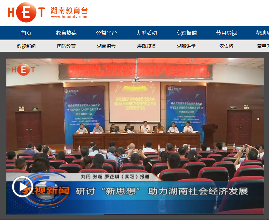 湖南教育电视台7月16日教视新闻14分27秒处,以《研讨“新思想”助力湖南社会经济发展》为题,对在我校召开的湖南省经济学学会会员代表大会暨习近平新时代中国特色社会主义经济思想研讨会进行了报道。