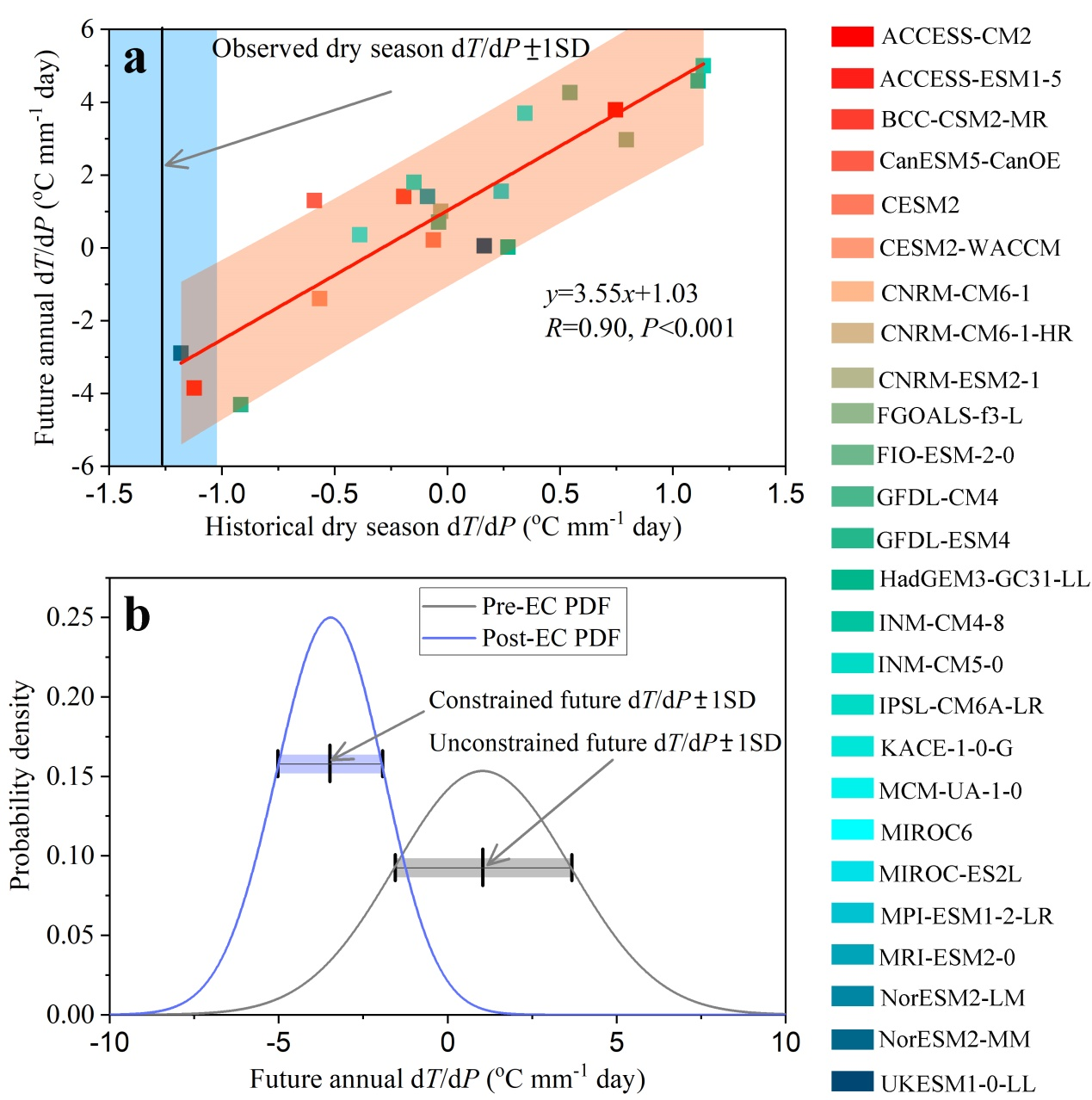 研究针对长期以来气候模型预测的高度不确定性,以热带地表(23.5oS~23.5oN,180oW~180oE)为研究对象,基于IPCC(政府间气候变化专门委员会)第六次耦合模式比较计划(CMIP6)中的26个全球气候模式输出结果,并考虑不同碳排放系列情景(SSP126、SSP245、SSP370和SSP585),建立以上气候要素未来值与历史值之间的紧急约束关系,将未来(2015~2100年)dT/dP预测值的不确定性减小9.4%~41.4%。相比于正负不定的CMIP6模式原始dT/dP输出结果,紧急约束后dT/dP均为负值,取值范围为-1.10 oC mm-1 day~-3.52 oC mm-1 day。与此对应,热带地表蒸散发(ET)速率由CMIP6模式原始输出结果0.292 mm yr-1变为紧急约束后的-0.469 mm yr-1。以上变化使得热带地表叶面积指数增长速率上升58.7%。