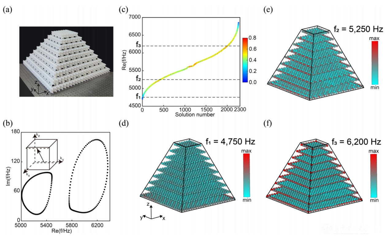 图2.三维声子晶体中表面依赖的趋肤效应观测。(a)具有金字塔形状的奇异线半金属声子晶体样品。