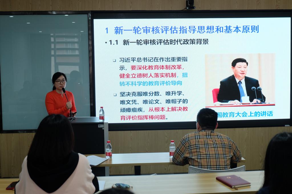 会上,副院长吴悠首先传达学校本科教育教学审核评估教学院工作布置会的会议精神,明确在本轮审核评估中我校申请参加第二类第一种类型评估,重点以学术型人才培养为主要方向的普通本科高校。接着,院教务办公室主任兼院评估工作小组联络员余志介绍新一轮本科教育教学审核评估时代政策背景、指导思想、基本原则、突出特点和审核评估流程,并对本轮审核评估的指标体系构成及内涵进行解读。随后吴悠从学校审核评估工作方案到学院审核评估工作方案的指标任务对接进行详细阐述,明确学院审核评估指标及审核评估的主要工作内容及任务指标,并对涉及的各部门人员安排、工作任务、进度安排等方面进行布置。