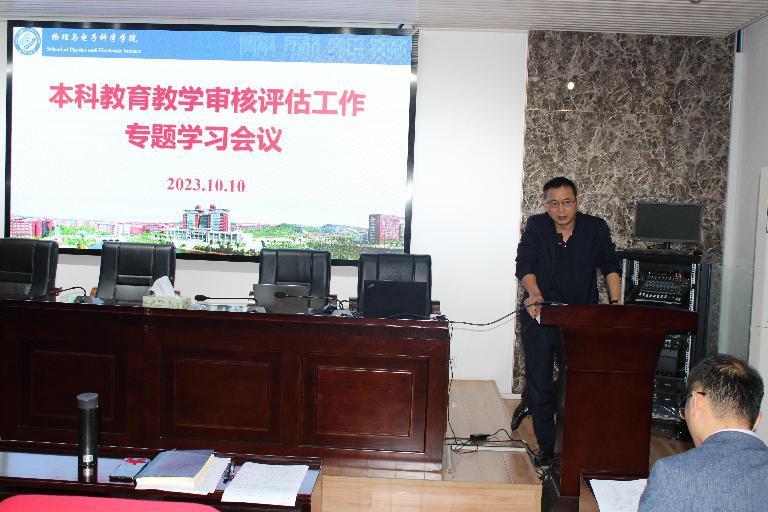 为全面贯彻党的二十大精神,积极落实教育部《普通高等学校本科教育教学审核评估实施方案(2021-2025 年)》(教督〔2021〕1 号)精神,全面落实立德树人根本任务,全面提升办学质量和育人水平,高质量完成新一轮本科教育教学审核评估工作,10月10日,物电学院在理科楼B413召开全体教职工会议,开展“本科教育教学思想大学习”活动。会议分三个阶段,由张国强书记主持。
